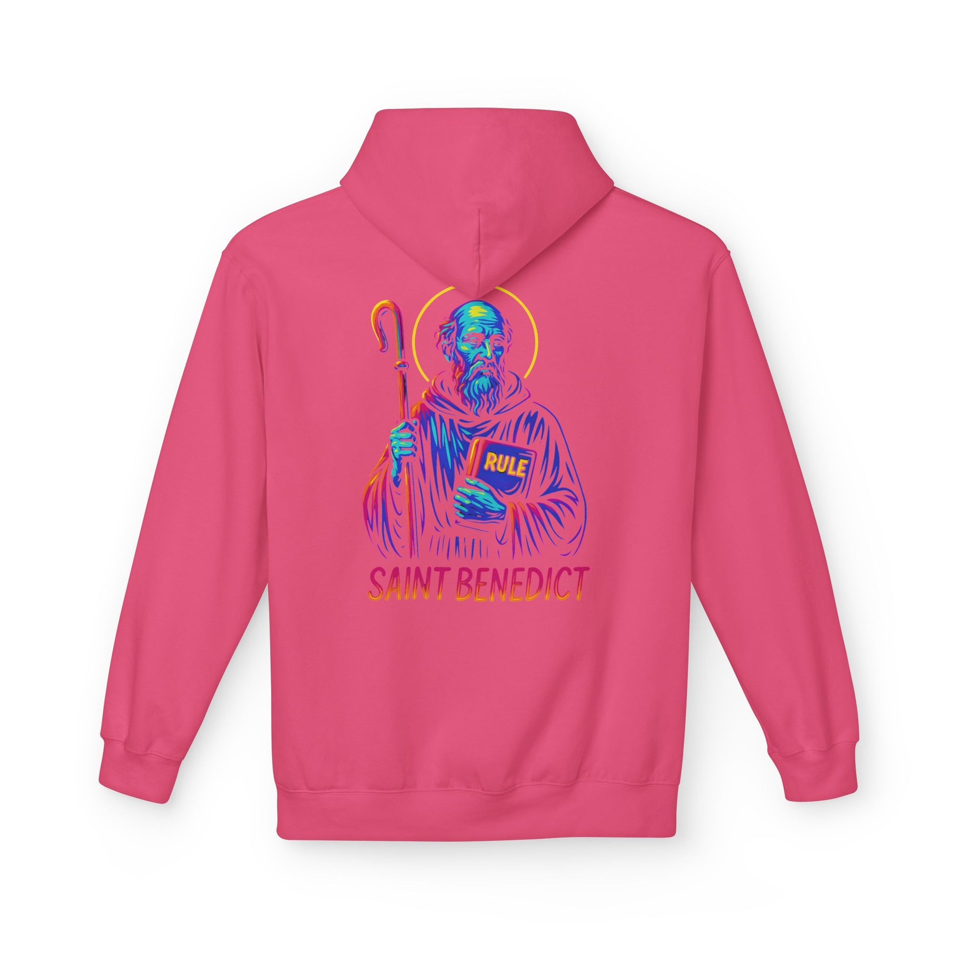 The St. Benedict Hoodie is part of the Saints Hood Collection, where each saint’s story is reimagined in bold, neon-infused streetwear fashion.