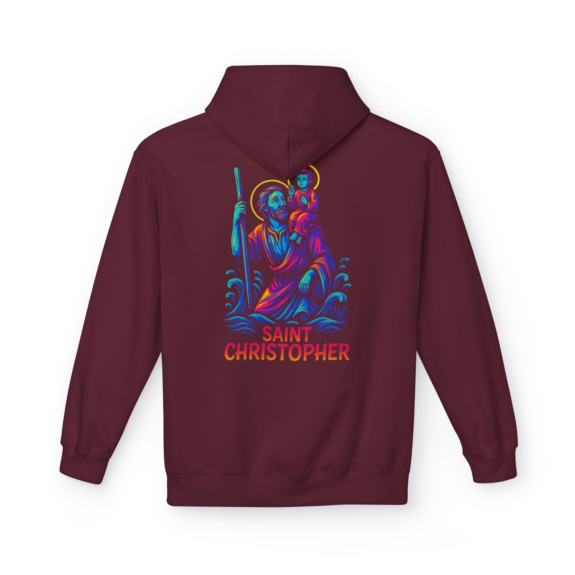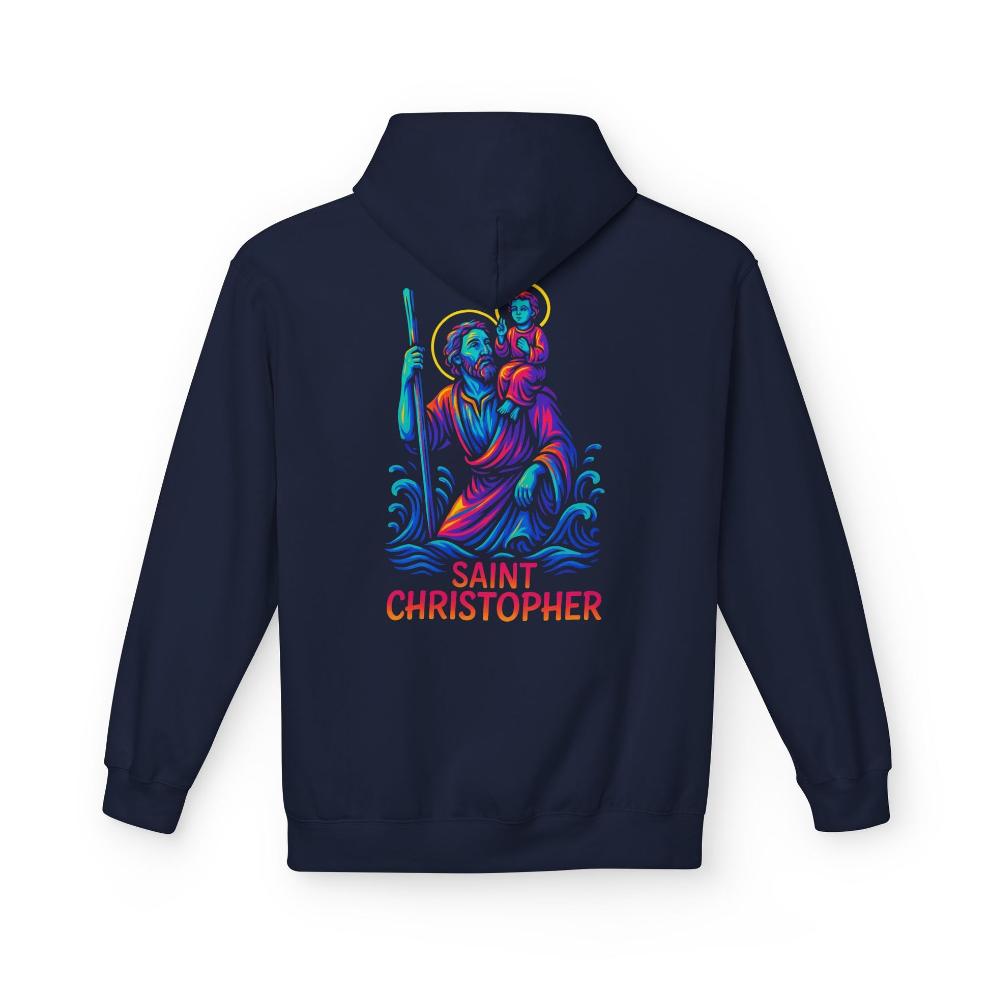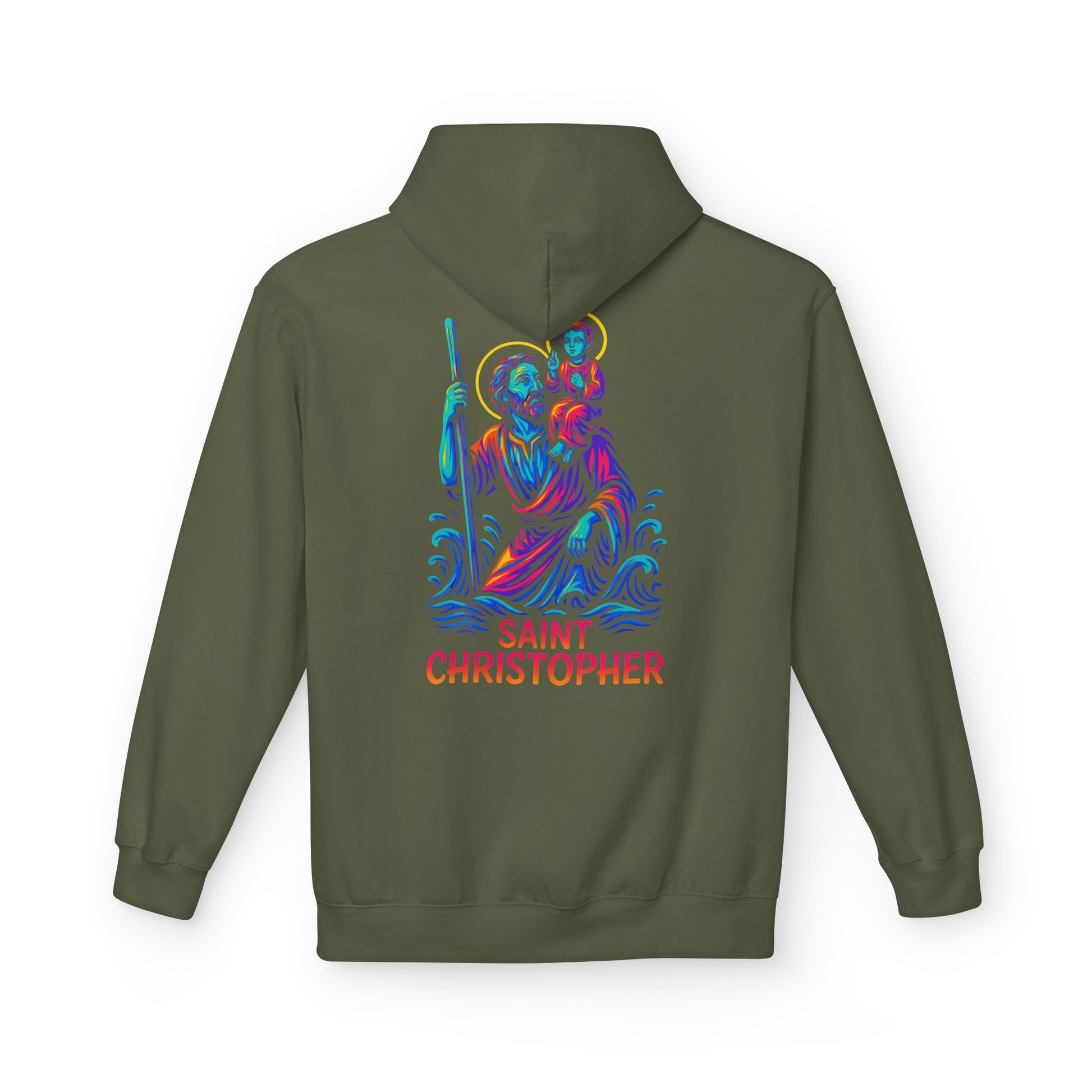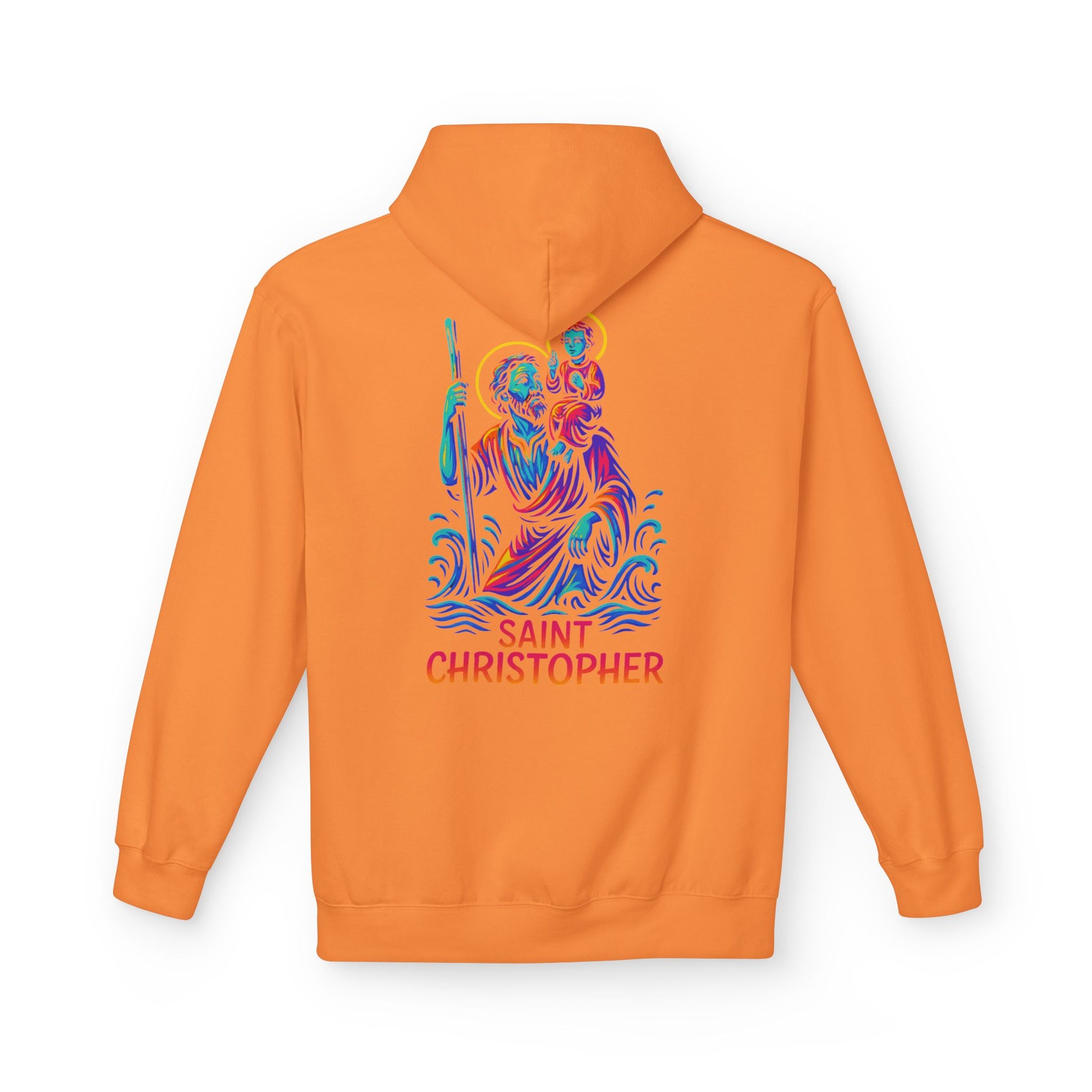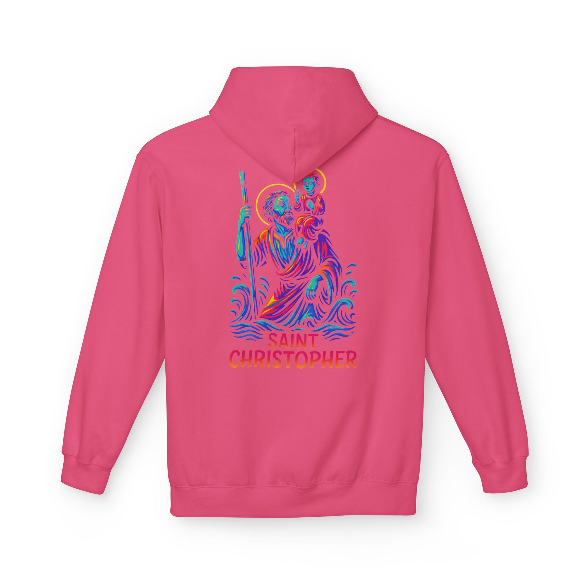 Carry the strength and protection of St. Christopher, the patron saint of travelers, with this bold Catholic hoodie. Featuring a striking neon graffiti-inspired design with glowing halo and waves, this hoodie blends Catholic devotion with modern streetwear fashion—perfect for anyone who wants to live their faith with confidence and style.