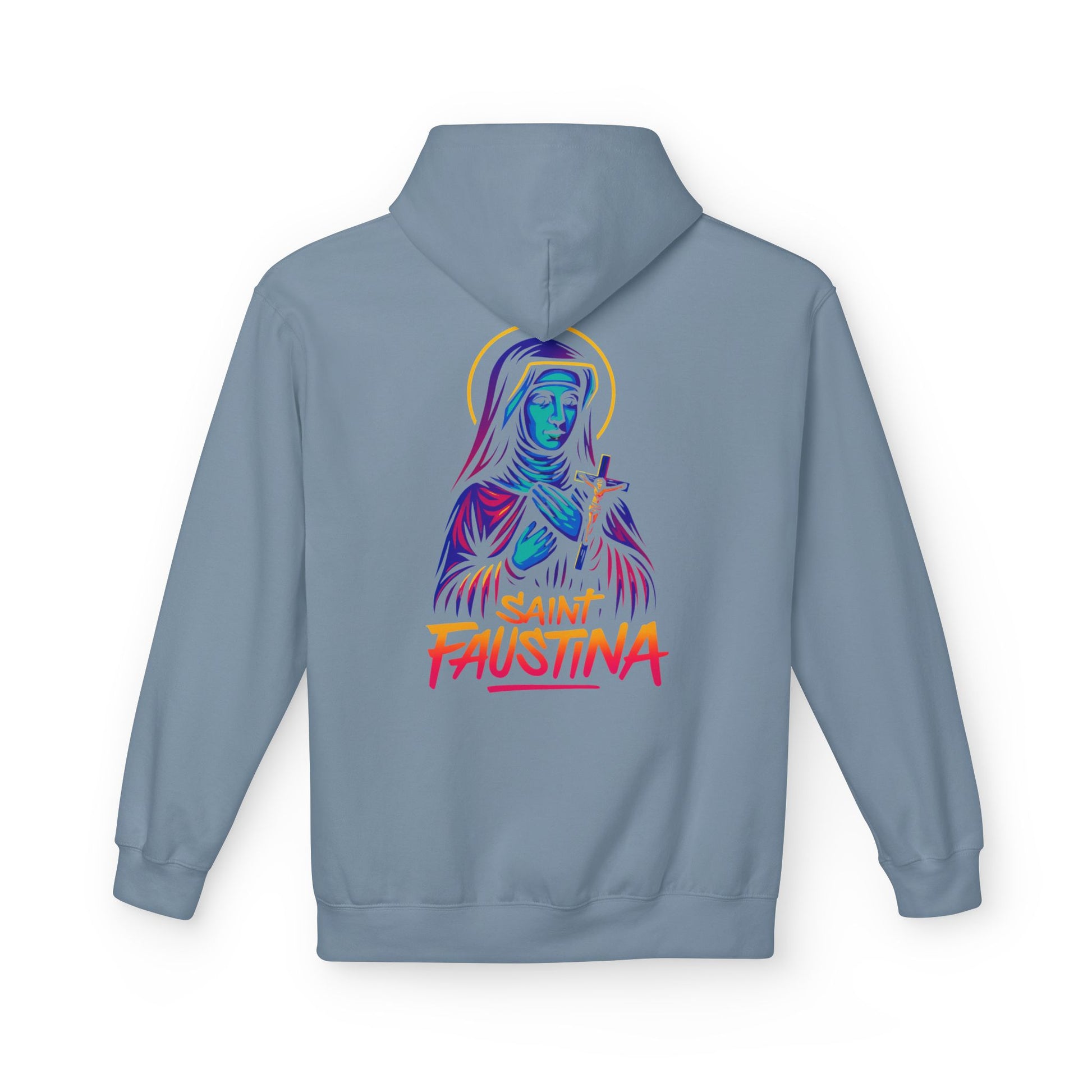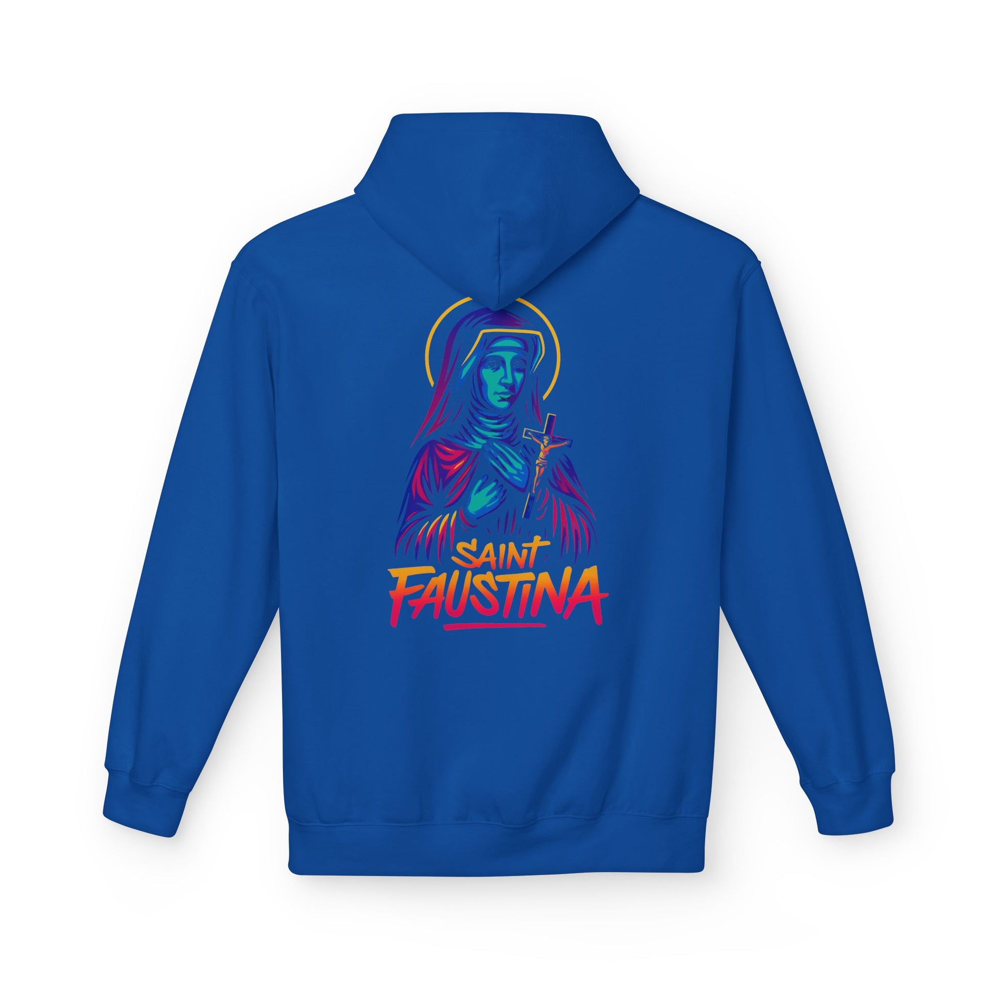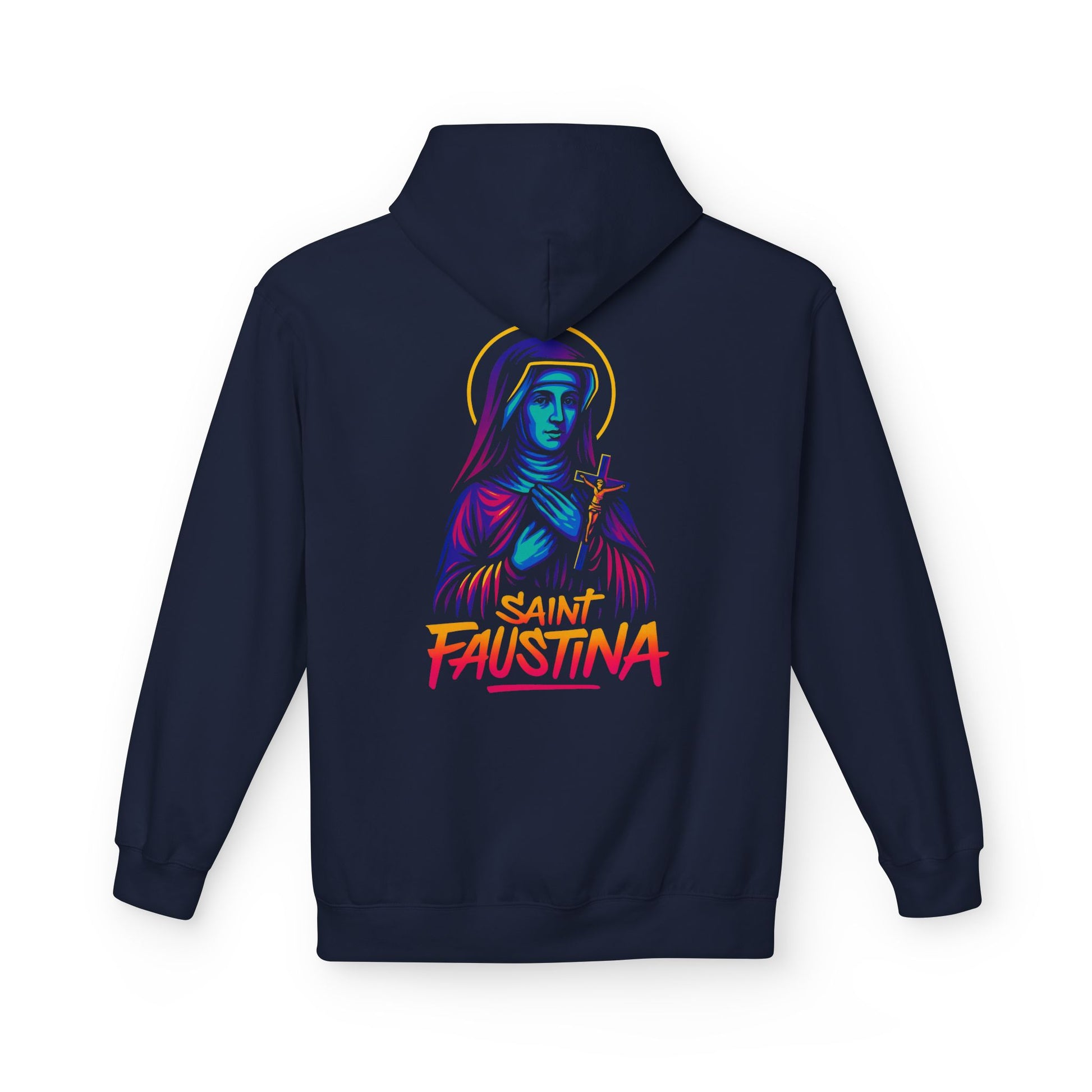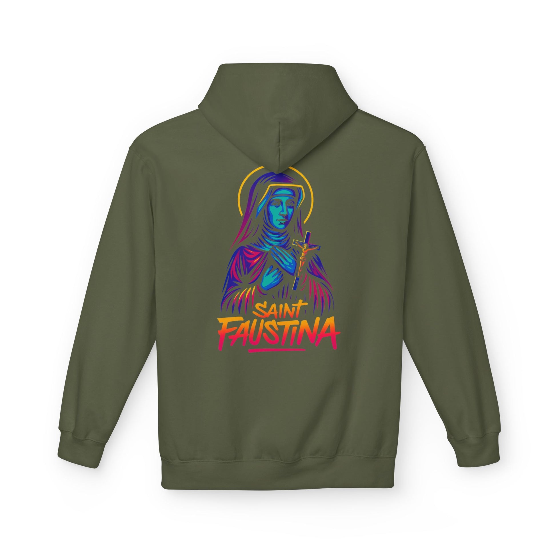 The St. Faustina Neon Hoodie brings the Apostle of Divine Mercy to life in a vibrant, street-art re-imagination that radiates God’s compassion through electric light and fearless style.