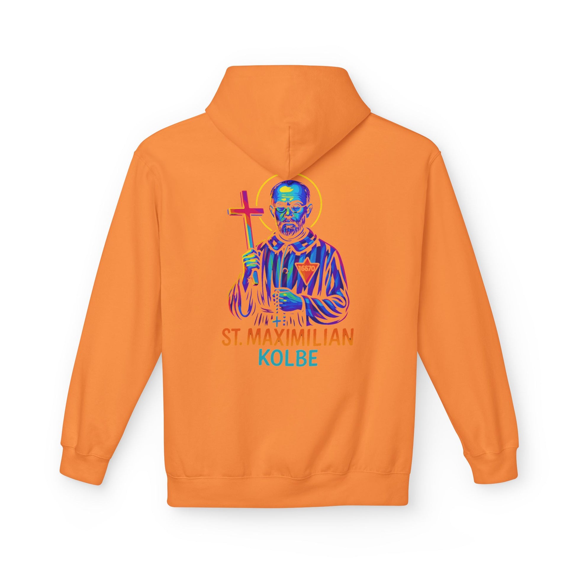 Unique Catholic saint hoodie featuring St. Maximilian Kolbe