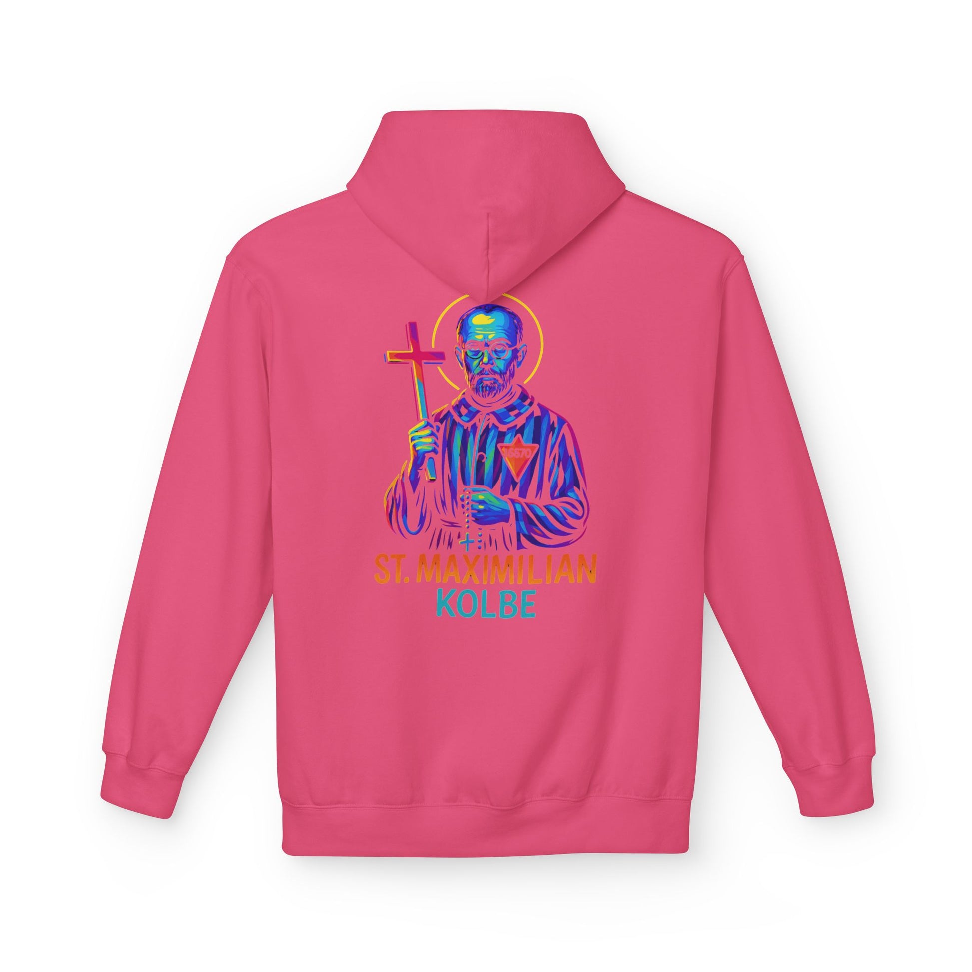 The St. Maximilian Kolbe Hoodie is part of the Saints Hood Collection, where Catholic saints are reimagined in bold, neon streetwear style.
