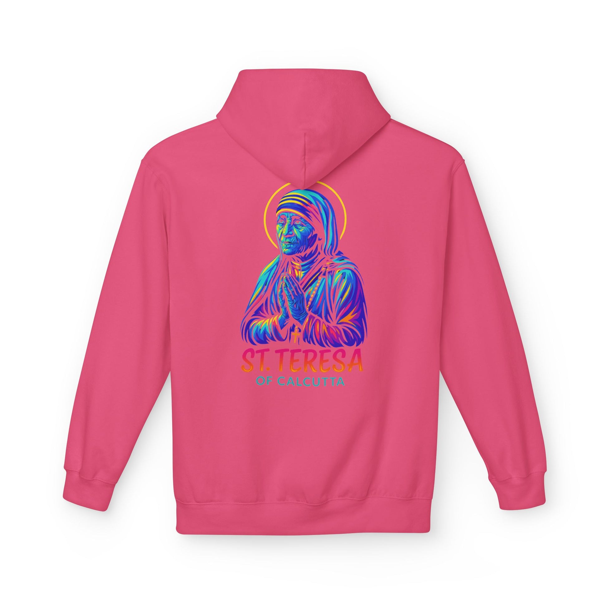 The St. Teresa of Calcutta Hoodie is part of the Saints Hood Collection, where Catholic devotion meets bold, neon-infused streetwear.